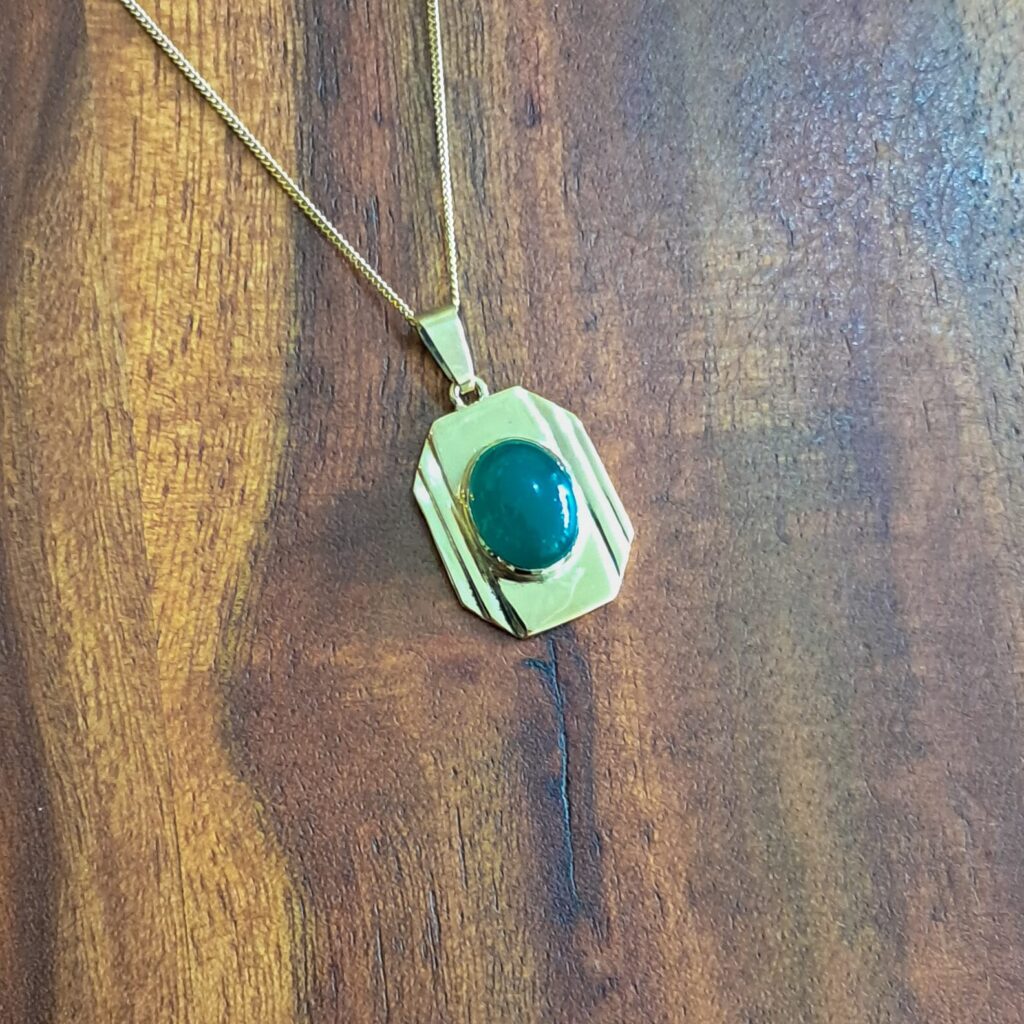 Deze hanger staat prachtig boven een chique avondjurk, maar kan ook moeiteloos gecombineerd worden met een eenvoudig bloesje of coltrui. De warme gouden tint en het diepe groen van de jade geven elk outfit een luxe accent.