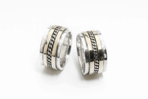Liever geen standaard trouwringen voor uw bruiloft? Deze bijzondere ringen uit mijn vaste collectie zijn vervaardigd in de Japanse smeedtechniek Mokume Gane, wat letterlijk “houtnerfstructuur” betekent. De techniek is verwant aan damast (of Damascus), bekend van traditionele messen, en zorgt voor een fascinerend patroon van vloeiende lijnen en natuurlijke lagen.
