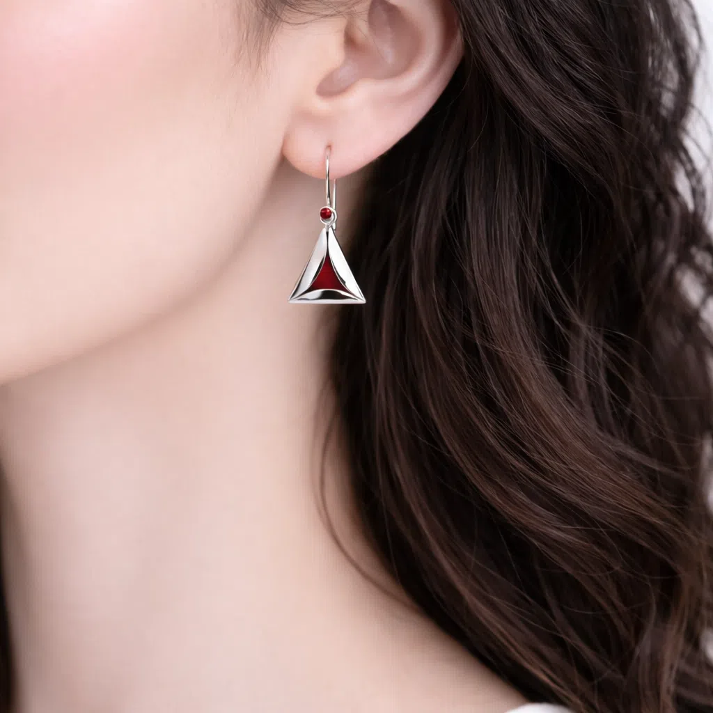 De binnenzijde is afgewerkt met dieprode emaille als knipoog naar de rijke, zoete kern van het hamansoortje. Het contrast tussen het hoogglanzende zilver en het warme rood geeft deze oorbellen een feestelijke uitstraling, terwijl de strakke lijnen ze ook geschikt maken voor dagelijks dragen.